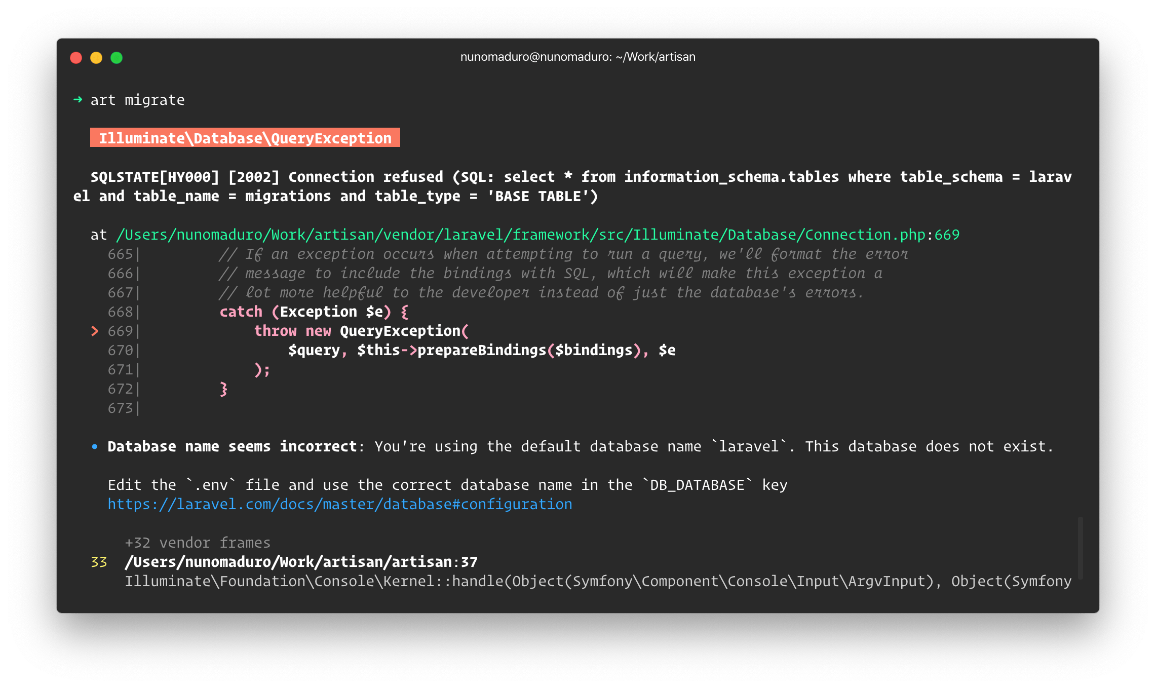 现在,默认的 laravel/laravel 应用包含了由 Nuno Maduro 维护的 Collision 的 dev Composer 第三方依赖包,当我们在命令行中与 Laravel 应用进行交互时,它会提供美观的错误报告信息: